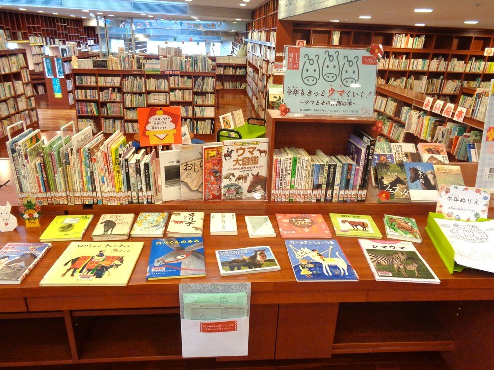 2026年の干支が午(ウマ)であることから、ウマやウマ科の動物(ロバやシマウマ)が登場する本の展示を行っています。