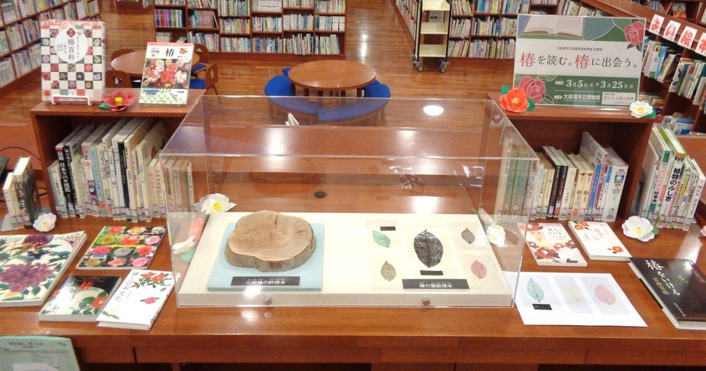 第36回全国椿サミット大船渡大会(3/14-15)と、市立博物館企画展「花ひらく椿の世界」(5/10まで)に関連して、ツバキの図鑑をはじめ、つばき油の活用法やツバキが題材の物語など、さまざまな資料を紹介しています。