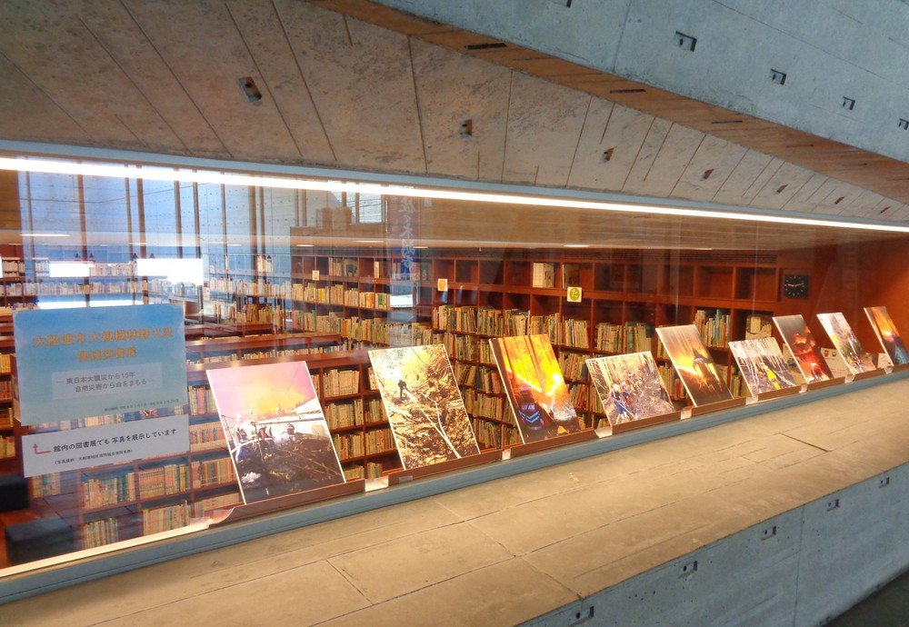 大規模林野火災の発生から1年を迎える節目に、関連する蔵書と資料を展示した図書展を開催しています。展示コーナー及び図書館入り口付近にて、大船渡地区消防組合消防本部より提供を受けた写真も展示しています。